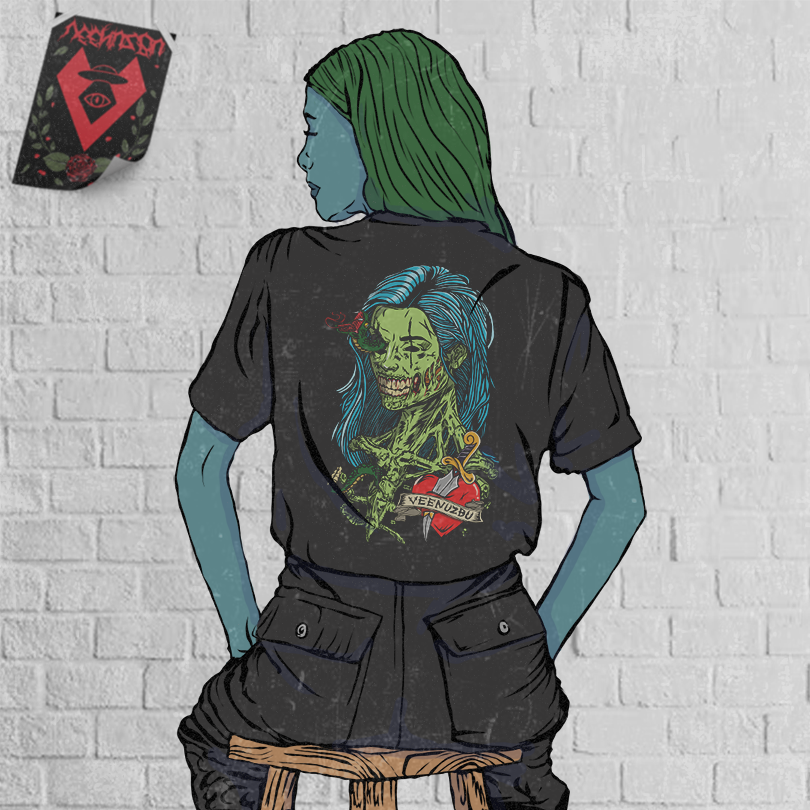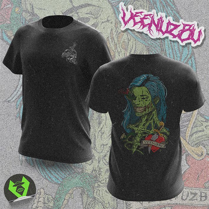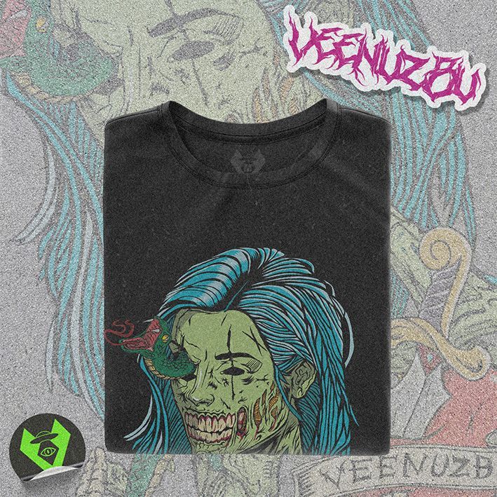 A imagem apresenta uma figura feminina transformada em zumbi, com uma estética bastante peculiar e impactante.